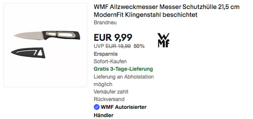 Wmf-direkt bietet aktuell bei eBay das WMF ModernFit 21,5 cm Allzweckmesser NEU&OVP für 9,99€ inkl. Versand an, solange der Vorrat reicht. Klinge aus rostfreiem und säurebeständigem Spezialklingenstahl mit Antihaftbeschichtung Gesamtlänge 21,5 cm Klingenlänge 9 cm Griff aus hochwertigem Kunststoff Klingenschutz für eine sichere Aufbewahrung, inklusive platzsparender Standfunktion Dieses stylische Allzweckmesser für die Küche wurde von Amazon Kunden mit sehr guten 4,6 Sternen benotet (26 Sternebewertungen).