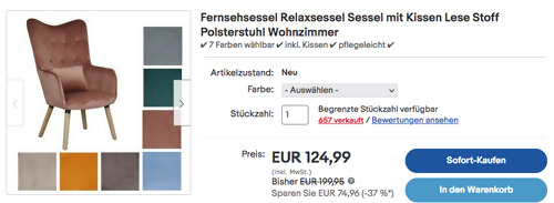 Estexo-home-and-garde bietet aktuell bei eBay den ESTEXO Fernsehsessel/Polstersessel in verschiedenen Farben NEU&OVP für 124,99€ inkl. Verand an, solange der Vorrat reicht. Rückenlehne mit attraktiver Knopfsteppung Material: Stoff Stabile Holzbeine Loses Kissen inklusive Maße gesamt (HxBxT) ca.: 101 x 63 x 63 cm Sitzhöhe ca.: 41 cm Polsterung Sitzfläche ca.: 6 cm Dieser bequeme Polstersessel wurde von Amazon Kunden mit sehr guten 4,3 Sternen benotet (131 Sternebewertungen).