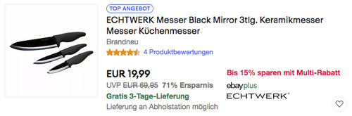 Deltatecc-home bietet aktuell bei eBay das 3-teilige ECHTWERK EW-KM-0150 Black Mirror Keramikmesser Set NEU&OVP für 19,99€ inkl. Versand an, solange der Vorrat reicht. Kochmesser: 15,8 cm Klingenlänge Universalmesser: 9,5 cm Klingenlänge Schälmesser: 7,4 cm Klingenlänge Klingen aus Zirkonia-Keramik Dieses geschmacks- und geruchsneutrale Keramikmesser Set wurde von Amazon Kunden mit 4,2 Sternen bewertet (43 Sternebewertungen).