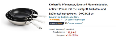 Amazon bietet aktuell ausgewählte Pfannen und Töpfe von Top-Marken billiger an, solange der Vorrat reicht. Das KitchenAid 20/24/28 cm Pfannenset bekommt man im Laufe dieser Aktion für 125,99€. 20,24 und 28 cm Edelstahl Antihaft Pfannenset (3-teilig) mit einem Edelstahlgriff und einem gewölbten Rand für leichtes, tropffreies Ausgießen Schwerer Edelstahl-Induktionsboden mit Aluminiumkern für schnelles und gleichmäßiges Erhitzen 3-Schicht-Antihaftbeschichtung Backofen- und Spülmaschinengeeignet für alle Herdtypen geeignet inklusive Induktion Amazon Kunden haben dieses hochwertige Pfannenset mit sehr guten 4,9 Sternen benotet (25 Sternebewertungen).