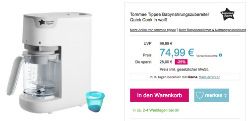 Babymarkt.de bietet heute 02.07.21, als Tagesangebot unter anderem den Tommee Tippee Babynahrungszubereiter "Quick Cook" in Weiß für 74,99€ inkl. Versand an, solange der Vorrat reicht. Dämpfe und püriere die hausgemachte Babynahrung in wenigen Minuten Geeignet für Obst, Gemüse, Fleisch und Fisch Inklusive handlichem Spachtel im Griff und einen automatischen Timer zum Einstellen von Dämpfungs- und Pürierzeiten 200g maximale Kapazität Dieser Nahrungszubereiter für Babys oder im Pflegefall wurde von Amazon Kunden mit 4,2 Sternen bewertet (126 Sternebewertungen).
