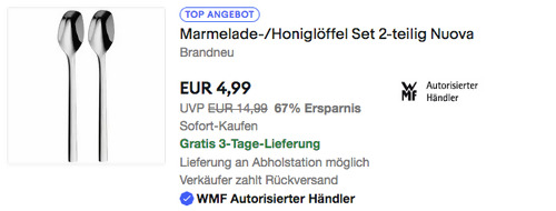 Bei eBay werden aktuell ausgewählte Artikel von WMF billiger angeboten, solange der Vorrat reicht.Das 2-teilige WMF Nuova Marmelade-/Honiglöffel Set NEU&OVP bekommt man im Laufe dieser Aktion für 4,99€ inkl. Versand. 2x Honig-/ Marmeladelöffel (Länge 16,0 cm) Material: Cromargan Edelstahl 18/10 poliert Herstellernummer: 12.9122.6042 Diese formschönen und funktionellen Löffel wurden von Amazon Kunden mit sehr guten 4,7 Sternen benotet (121 Sternebewertungen).