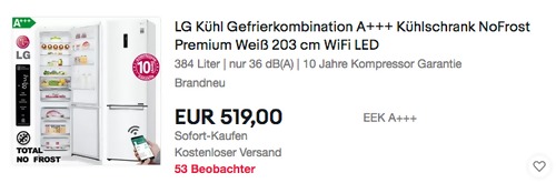 Aruh_vertrieb bietet aktuell bei eBay die LG GBB72SWDFN Kühl-/ Gefrierkombination in Weiß NEU&OVP für 519€ inkl. Versand an, solange der Vorrat reicht. XL Raumwunder mit 384 Liter Nutzinhalt 277 Liter Kühlen NoFrost Abtauautomatik Express Cooling - schnelles Kühlen nach großen Einkäufen 4 Abstellflächen aus Sicherheitsglas 107 Liter Gefrieren 3 transparente Schubladen Express Freeze - schnelles Gefrieren LINEAR Cooling™ - Temperaturunterschied im Kühlschrank reduziert auf ±0,5°C Door Cooling+ - bis zu 32%* schnellere und gleichmäßigere Kühlung im kompletten Kühlschrank LG Inverter Linear Kompressor Smart ThinQ™ WiFi Funktion Energieeffizienzklasse: A+++ Maße (H x B x T): 203,0 x 59,5 x 68,2 cm