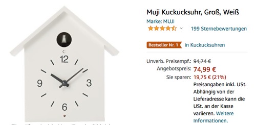 Amazon bietet aktuell die Muji C4A1012 Kuckucksuhr in Weiß für 74,99€ an, solange der Vorrat reicht. Muji Cuckoo White Clock wird aus sorgfältig handgefertigten Bälgen hergestellt Diese Kuckucksuhr twittert mit einem natürlichen Ton Wird mit einem Lichtsensor befestigt, der den Ton in einer dunklen Umgebung ausschaltet Maße L x B x H: 25.5 x 12.5 x 26.7 cm Amazon Kunden haben diese elegante Kuckucksuhr aus Japan mit sehr guten 4,7 Sternen benotet (79 Sternebewertungen).