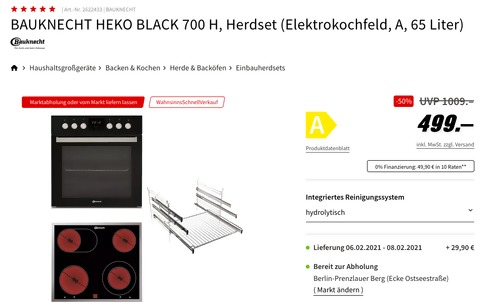 MediaMarkt bietet bis 14.02., 20 Uhr im Laufe der Wahnsinns Schnell Verkauf - Aktion ausgewählte Artikel billiger an, solange der Vorrat reicht.Das BAUKNECHT HEKO BLACK 700 H Herdset bekommt man im Laufe dieser Aktion für 499€ zzgl. 29,90€ Lieferung. In einigen Regionen bietet MediaMarkt aktuell eine versandkostenfreie Abholung von online bestellten Artikeln weiterhin an. Bauknecht Glaskeramik-Kochfeld: Bedienelemente: Elektronik-Uhr mit Touch-Control, Drehknebel. 4 Kochzonen, davon 1 Bräter-ZweikreisKochzone, 1 DUO-ZweikreisKochzone Flacher Edelstahl-Rahmen 4-fach Restwärmeanzeige Abmessungen Nischengröße, minimal: 560 mm / 600 mm / 550 mm Eingangsspannung: 220-240 Volt Farbe: Schwarz/Edelstahl Bauknecht Einbau-Herd: Garraum-Temperatur bis 250 °C Heißluftherd mit 8 Funktionen Hydrolyse-Reinigungsfunktion Garraumvolumen 65 Liter 3-fach Teilauszug inkl. 1x Gitterrost, 1x Backblech emailliert, 1x Fettpfanne MediaMarkt Kunden haben dieses Herdset mit 5 Sternen benotet (3 Bewertungen).