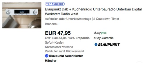 Latupo bietet aktuell bei eBay das BLAUPUNKT KRD 20 DAB+ Küchenunterbauradio in Weiß NEU&OVP für 47,95€ inkl. Versand an, solange der Vorrat reicht. DAB + und UKW PLL Empfänger 30 Senderspeicher 2 Countdown-Timer Weckfunktion LC-Display mit Multianzeige, Dimmfunktion und Stromsparmodus RMS-Leistung: 2x 0,8 Watt Breite: 26 cm Höhe: 5,2 cm Länge: 16,5 cm Dieses formschöne Küchenunterbauradio wurde von Amazon Kunden mit sehr guten 4,4 Sternen benotet (365 Sternebewertungen).