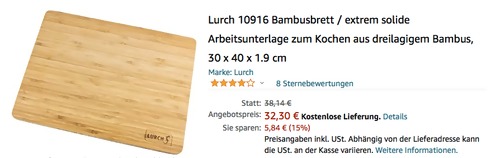 Amazon bietet aktuell ausgewählte Küchenhelfer von Lurch billiger an, solange der Vorrat reicht. Das 40 x 30 cm Lurch 10916 Bambus Schneidbrett bekommt man im Laufe dieser Aktion für 32,30€. Antibakteriell - geöltes Bambusbrett, welches beidseitig verwendbar ist Der dreischichtige Queraufbau sorgt dafür, dass das Schneidbrett dauerhaft absolut eben aufliegt und macht das Brett außerdem extra leicht, stabil und robust. Kein Verziehen Nicht Spülmaschinengeeignet Amazon Kunden haben dieses Schneidbrett mit 4 Sternen bewertet (4 Sternebewertungen).