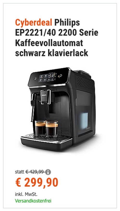Bei cyberport.de bekommt man bis zum 10.02.21 im Laufe der Cyberdeals-Aktion unter anderem den Philips EP2221/40 2200 Serie Kaffeevollautomat in Schwarz Klavierlack für 290,90€ inkl. Versand, solange der Vorrat reicht. Bedienung/Anzeigen: Intuitive SensorTouch Oberfläche 2 aromatische Kaffeespezialitäten (Espresso, Kaffee) Gleichzeitige Zubereitung von 2 Tassen Scheibenmahlwerk, Keramik, 12 Stufen Pumpendruck: 15 bar Automatische Spül- und Reinigungsprogramme Kapazität Bohnenbehälter: 275g Kapazität Wassertank: 1,8l Leistung: 1.500 Watt Dieser Kaffeevollautomat mit klasssischem Milchaufschäumer wurde von Cyberport Kunden mit 4,5 Sternen benotet (122 Bewertungen).