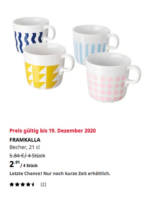 IKEA FRAMKALLA Becher, verschiedene Muster, 21 cl, 4 StückAngebot gültig bis 19. Dezember 2020 bei IKEA Würzburg, solange der Vorrat reicht.