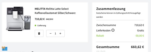 Dank dem 50€ Direktabzug im Warenkorb bekommt man bis 31.12.20 bei SATURN Online Shop den Melitta Latte Select F63/0-201 Kaffeevollautomat in Silber/Schwarz für 660,62€ inkl. Versand, solange der Vorrat reicht. 12 Kaffeerezepte, My Coffee Memory Funktion für 6 Personen TFT-Farbdisplay mit One Touch Brühtechnologie: Aroma-Extraction-Systems, Vorbrühfunktion 2 Tassen-Funktion Mahlgrade: 5-stufig Inhalt Bohnenbehälter: 270 g Pumpendruck: 15 bar Fassungsvermögen des Wassertanks: 1.8 l externer Milchbehälter Maximale Leistung: 1400 Watt