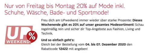 Otto.de bietet bis zum 07.12.20 mit dem Gutscheincode: 12422 einen 20 % Rabatt auf ausgewähltes Modesortiment inkl. Schuhe, Wäsche, Bade- und Sportmode an, solange der Vorrat reicht.Dank dem Gutscheincode: 80681 spart man 5,95€ Versandkosten (gilt bis 21.12.2020, für max. 4 Bestellungen)Dank dem Gutscheincode: 81258 bekommen Neukunden bis zum 31.12.20 einen 15€ Rabatt und die Liefer-Flat für 6 Monate gratis.Beispiel Warenkorb:Das Bench. Mädchen Sweatshirt in Grau/Weiß/Schwarz und in Größen 128-182, als Tagesangebot kostet heute 24,99€, bekommt man im Laufe dieser Aktion für 19,99€ inkl. Versand. Rundhalssweatshirt in weiter, modischer Form Mit großen Logo-Drucken Obermaterial: 100% Baumwolle Einsatz: 90% Baumwolle, 10% Viskose Streifenband, Logodruck, Glitzerband OTTO Kunden haben dieses Colorblocking Sweatshirt mit 5 Sternen benotet (20 Bewertungen).
