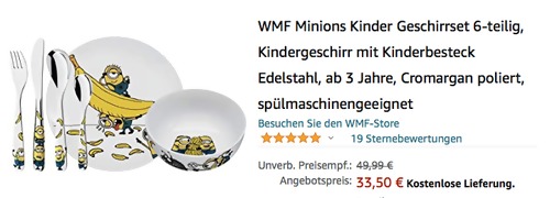 Amazon bietet aktuell ausgewählte Produkte von WMF billiger an, solange der Vorrat reicht. Das 6-teilige WMF Minions Kinder Geschirrset bekommt man im Lauf dieser Aktion für 33,50€. Kinder Besteckset 4-teilig (Länge 16,5/18,5/16,5/13,0 cm) 1x Kinderteller (Ø 19,0 cm) 1x Müslischale (Ø 13,8 cm, Höhe 6,0 cm) Kindermesser mit leichtem Wellenschliff Laffenrand des Löffels mit abgerundeten KantenKurze stumpfe Zinken der Kindergabel Material: Cromargan Edelstahl 18/10 poliert Hochwertige Geschenkverpackung Amazon Kunden haben dieses lustige Geschirrset mit sehr guten 4,8 Sternen benotet (19 Sternebewertungen).