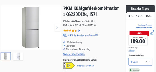 Lidl.de Onlineshop bietet heute, 13.07.24, als Deal des Tages unter anderem die PKM Kühlgefrierkombination "KG220DIX" für 189€ zzgl. 45,90€ Versand an, solange der Vorrat reicht. Fassungsvolumen: ca. 157 l Kühlen + Gefrieren: ca. 109 + 48 l Verfügt über 2 Glasablagen und 3 Türablagen Inox Design LED-Beleuchtung Low Frost Gefrierleistung: 2,2 Der jährliche Energieverbrauch nur 152 kW/h im Jahr Maße: ca. L 47,4 x B 49,5 x H 144 cm Wechselbarer Türanschlag