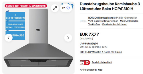 ROTCOM Deutschland bietet aktuell bei eBay die Beko HCP61310IH Dunstabzugshaube NEU&OVP für 77,77€ inkl. Versand an, solange der Vorrat reicht. Kaminhaube Anzahl Lüfterstufen: 3 Fettfilter-Typ: Metallfettfilter Fettfilter Anzahl: 2 Kohlefilter für den Umluftbetrieb: inklusive Lampentyp (W): 2x 3W LED Höhe (mm): 694-861 Breite (mm): 598 Tiefe (mm): 450 Material: Edelstahl
