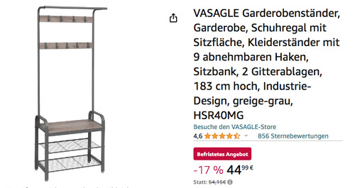 Amazon bietet aktuell den VASAGLE HSR40MG 183 cm Garderobenständer für 44,99€ an, solange der Vorrat reicht. Garderoben- und Schuhregal Kleiderständer mit 9 abnehmbaren Haken Sitzbank 2 Gitterablagen Produktabmessungen: 183T x 72B x 33,7H cm Material: Legierter Stahl Amazon Kunden haben diese praktische Garderobe mit sehr guten 4,6 Sternen benotet (491 Sternebewertungen).