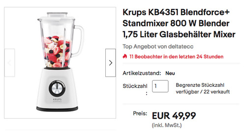 Deltatecc-home bietet aktuell bei eBay den Krups KB4351 Blendforce+ Standmixer NEU&OVP für 49,99€ inkl. Versand an, solange der Vorrat reicht. Leistungsstarker 800-W-Standmixer 1,75-l-Behälter aus hitzebeständigem Glas (bis zu 80 °C) 2 Geschwindigkeiten und eine Pulsfunktion Smart Lock -Technologie für einfaches Mixen in drei Schritten Effiziente Eiszerkleinerfunktion, ohne Motorüberlastung Dieser benutzerfreundliche Standmixer wurde von Amazon Kunden mit guten 4,3 Sternen benotet (768 Sternebewertungen).