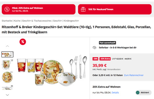Otto.de bietet bis 08.04.2024 einen 20% Rabatt auf ausgewählte Wohnen-Sortimente an, solange der Vorrat reicht.Nach Aktivierung wird dir die Ersparnis auf der Artikeldetailseite und im Warenkorb angezeigt. Beispiel Warenkorb:Das 10-teilige Ritzenhoff & Breker Kindergeschirr-Set Waldtiere bekommt man im Laufe dieser Aktion für 35,99€ zzgl. 2,95€ Versand. 1 x Frühstücksteller: 19 cm 1 x Kaffeebecher: 270 ml 1 x Schale: 16,5 cm 4-tl. Besteck 3 Trinkgläser Aus hochwertigem Porzellan und 18/10 Edelstahl, Glas lebensmittelecht, mikrowellengeeignet