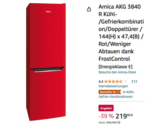 Amazon bietet aktuell ausgewählte Hausgeräte von Amica billiger an, solange der Vorrat reicht. Die Amica AKG 3840 R Kühl-/Gefrierkombination in Rot bekommt man im Laufe dieser Aktion für 219,90€. Kapazität: 157 Liter Frischkostvolumen: 109 Liter Elektronische Steuerung FrostControl Superkühl- & Supergefrierfunktion Türanschlag wechselbar Leiser Betrieb Sicherheitsglas Gemüseschublade LED-Beleuchtung Artikelabmessungen: 49.50 cm x 47.40 cm x 1.44 Meter Dieser günstige und farbenfrohe Kühlschrank für einen Single- oder Zwei-Personen-Haushalt wurde von Amazon Kunden mit sehr guten 4,4 Sternen benotet (313 Sternebewertungen).