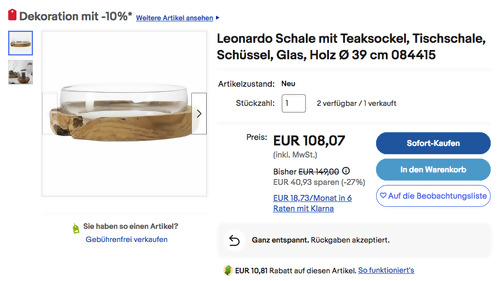 Dank dem Gutscheincode: WOHNEN2024 (zur Kasse gehen und dort einlösen) bekommt man bei eBay bis zum 24.1.24 einen 10% Rabatt (2x einlösbar max. 50€) auf ausgewählte Wohnartikel, solange der Vorrat reicht. Die Leonardo 084415 Schale mit Teaksockel NEU&OVP bekommt man im Laufe dieser Aktion für 79,11€ inkl. Versand an, solange der Vorrat reicht. Material: Glas, Holz Höhe: 12 cm Durchmesser Ø: 39 cm tolles Deko-Objekt für handelsübliche Stumpenkerzen individuell Befüllbar Diese hochwertig gefertigte Schale wurde von Amazon Kunden mit guten 4,3 Sternen benotet (24 Sternebewertungen).