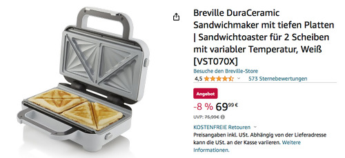 Amazon bietet aktuell ausgewählte Küchengeräte von Breville und Crock-Pot billiger an, solange der Vorrat reicht. Den Breville VST070X DuraCeramic Sandwichmaker bekommt man im Laufe dieser Aktion für 69,99€. Die tiefen Platten ermöglichen noch mehr Zutaten in bis zu 2 Sandwiches Die abnehmbaren Platten mit der einzigartigen, natürlichen DuraCeramic Beschichtung sorgen für bessere Ergebnisse im Vergleich zu standardmäßiger Antihaftbeschichtung Einstellungen für hohe und niedrige Temperaturen eignen sich für verschiedene Brotarten und Füllungen Amazon Kunden haben diesen hochwertigen Jumbo-Sandwichmaker mit sehr guten 4,5 Sternen benotet (573 Sternebewertungen).