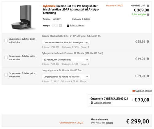 Cyberport bietet bis zum 17.01.24 9 Uhr im Laufe der Cyber Sale - Aktion den Dreame Bot Z10 Pro Saugroboter in Schwarz - ein smarter und funktioneller Saugroboter mit einer hervorragenden Navigation - für 299€ inkl. Versand an, solange der Vorrat reicht. Den Gutscheincode: CYBERSALE160124 im Warenkorb eingeben, um zum reduzierten Preis zu kommen. Saugroboter mit Wischfunktion LiDAR-Sensor, Kartographierung 4.000 Pa Saugkraft Staubbehälter-Volumen: 0,4 l Flüssigkeitsbehälter-Volumen: 150 ml 4 Liter Absaugstation 2,5h Laufzeit und automatische Aufladung Filter: HEPA; Schallleistungspegel: 64 dB(A) kompatibel zu Amazon Alexa Sprachsteuerung, mit Mi Home-App kompatibel Inkl. Ladestation, Absaugstation, Wassertank, Wischtuch