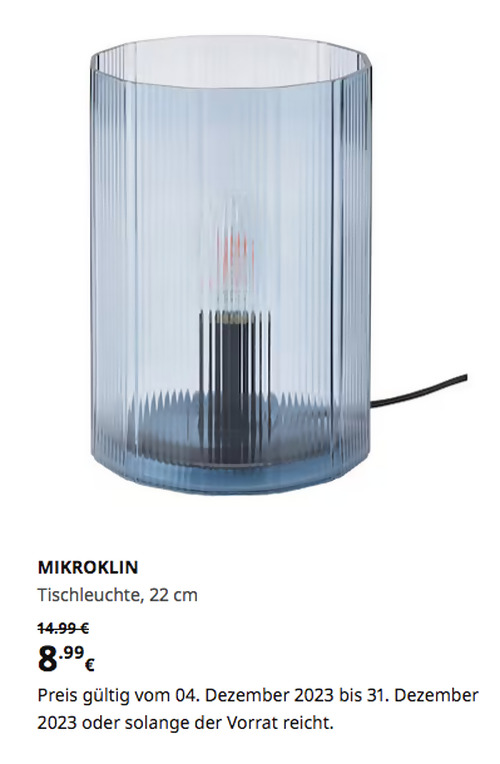 MIKROKLIN Tischleuchte, Glas blau, 22 cmAngebot gilt bis 31. Dezember 2023 bei IKEA München-Eching, gilt nicht für einen Kauf über Click & Collect und solange der Vorrat reicht.