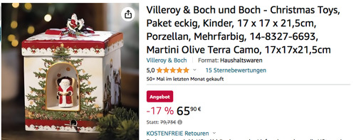 Amazon bietet aktuell ausgewählte Küchenprodukte von Tefal, Emsa, WMF, Villeroy & Boch und mehr billiger an, solange der Vorrat recht. Die Villeroy & Boch 14-8327-6693 Christmas Toys Geschenkebox mit Teelichthalter und Spieluhr bekommt man im Laufe dieser Aktion für 65,90€. Material : Porzellan Größe : 17x17x21,5cm Amazon Kunden haben diese nostalgische Weihnachtsdeko mit sehr guten 5 Sternen benotet (15 Sternebewertungen).