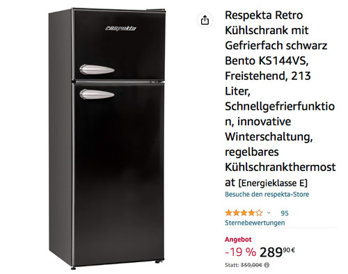 Amazon bietet aktuell ausgewählte Respekta Hausgeräte billiger an, solange der Vorrat reicht. Den Respekta KS144VS Bento 213 Liter Retro Kühlschrank mit Gefrierfach in Schwarz bekommt man im Laufe dieser Aktion für 289,90€. Nutzinhalt Kühlfach: 171 Liter Nutzinhalt Gefrierfach: 42 Liter Glasablagen: 4 Gemüseschubladen: 1 Schnellgefrierfunktion Winterschaltung autom. Abtaufunktion LED-Beleuchtung Energieef zienzklasse Skala von A bis G: E Abmessungen: 57 x 54 x 145 cm Amazon Kunden haben diese Kühl-Gefrierkombination im Vintage-Stil mit 4,1 Sternen bewertet (95 Sternebewertungen).