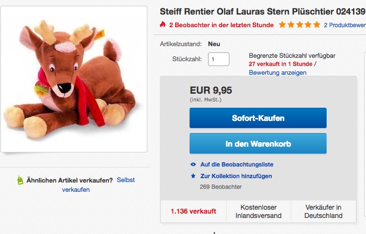 Bei Ebay wird aktuell das Steiff Rentier Olaf Lauras Stern Plüschtier 26 cm Neu und OVP für 9,95€ inkl. Versand angeboten.