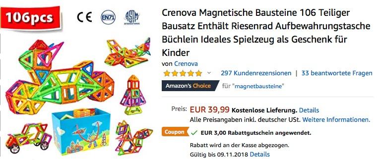 Dank dem 3€ Rabattgutschein (Coupon anklicken und der Rabatt wird automatisch beim Kauf an der Kasse abgezogen) bekommt man bis 9.11.18 bei Amazon das 106-teilige Crenova Magnetische Bausteine-Set für 36,39€ inkl. Versand.
