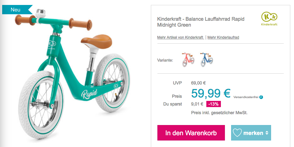 Babymarkt.de bietet heute, 10.04.20, als Tagesangebot unter anderem das Kinderkraft - Balance Lauffahrrad "Rapid" in verschiedenen Farben für 59,99€ inkl. Versand an, solange der Vorrat reicht.