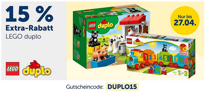 MyToys.de bietet bis zum 27.04.20 mit dem Gutscheincode: DUPLO15 einen 15 % Extra-Rabatt auf ausgewählte Artikel der Marke LEGO Duplo an, nur einmalig einlösbar.