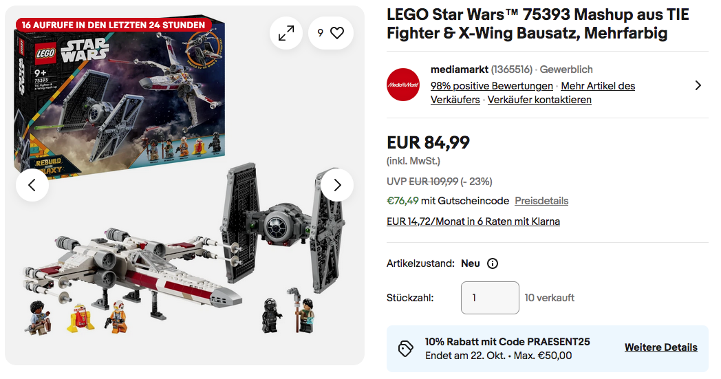 Den LEGO Star Wars 75393 Mashup aus TIE Fighter & X-Wing Bausatz NEU&OVP bekommt man im Laufe dieser Aktion für 76,49€ inkl. Versand an, solange der Vorrat reicht.