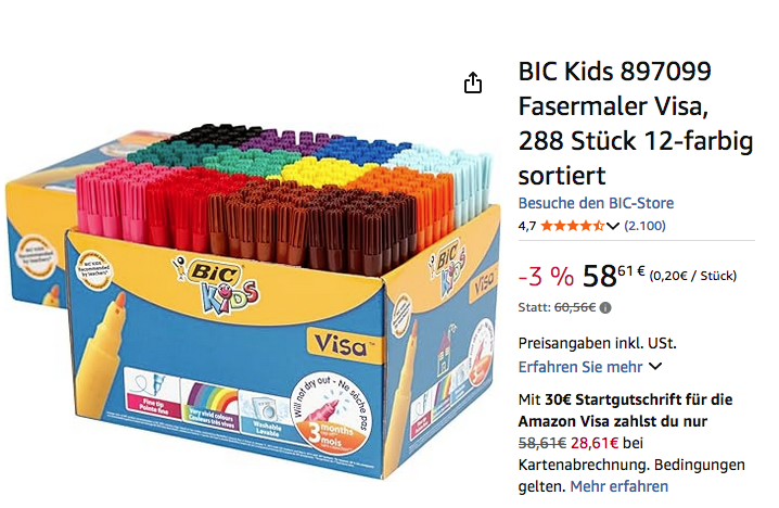 Amazon bietet aktuell die BIC Kids 897099 288 Stück Fasermaler Visa Klassen-Packung für 51,47€ an, solange der Vorrat reicht.