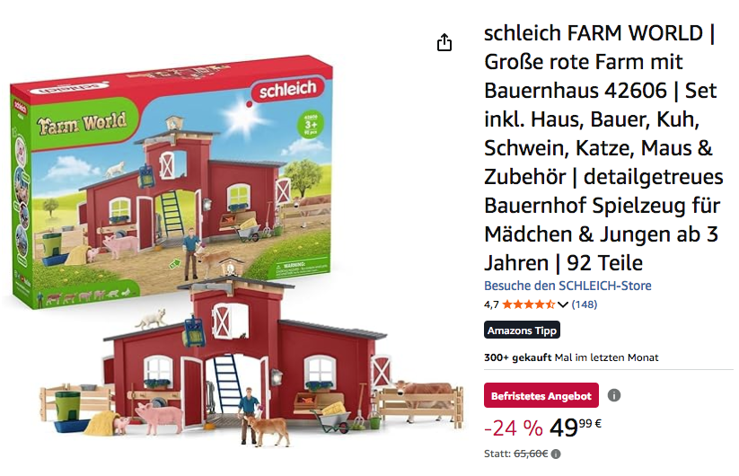 Amazon bietet aktuell die Schleich 42606 FARM WORLD Große rote Farm mit Bauernhaus und Zubehör für 49,99€ an, solange der Vorrat reicht.