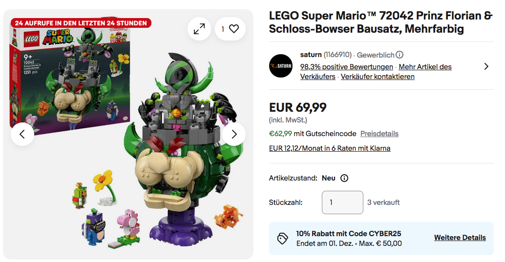 Den LEGO Super Mario 72042 Prinz Florian & Schloss-Bowser Bausatz NEU&OVP bekommt man im Laufe dieser Aktion für 62,99€ inkl. Versand an, solange der Vorrat reicht.