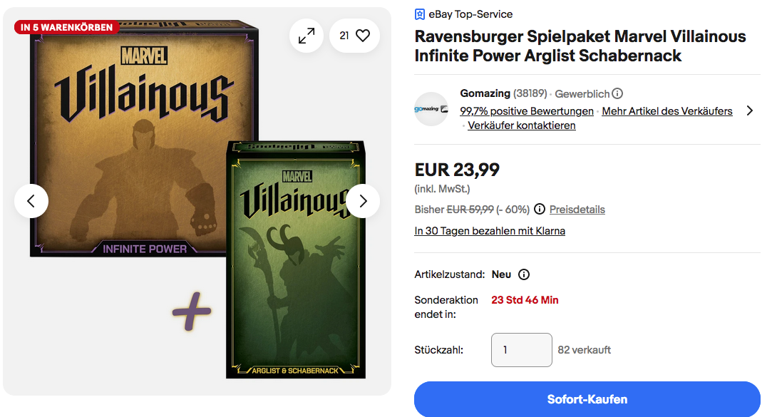 Gomazing bietet aktuell bei eBay das Ravensburger Spielpaket: Marvel Villainous Infinite Power + Arglist Schabernack NEU&OVP für 23,99€ inkl. Versand an, solange der Vorrat reicht.