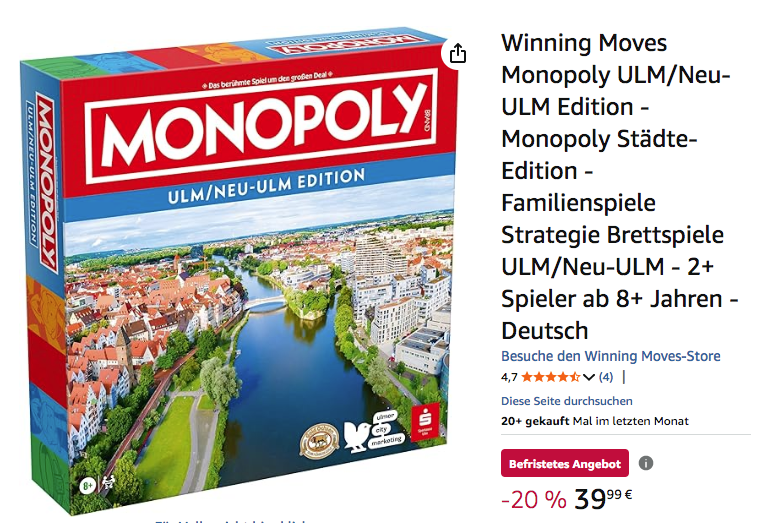 Amazon bietet aktuell die Winning Moves Monopoly ULM/Neu-ULM Edition für 39,99€ an, solange der Vorrat reicht.