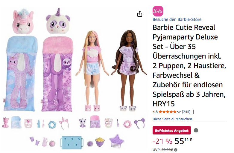 Amazon bietet aktuell das Barbie Cutie Reveal Pyjamaparty Deluxe Set inkl. 2 Puppen für 55,11€ an, solange der Vorrat reicht.