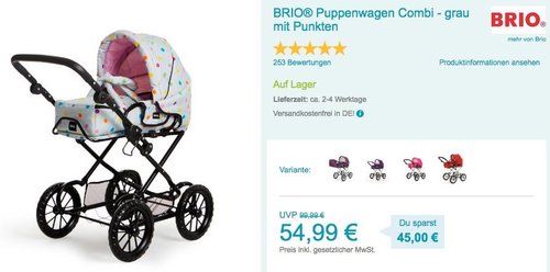 Babymarkt.de bietet heute, 29-10-18, als Tagesangebot den BRIO® Puppenwagen Combi in Grau mit Punkten für 54,99€ inkl. Versand an. Ein zusammenklappbares Gestell Maße: 79 x 43 x 59 cm Seitentaschen und einen geräumigen Einkaufskorb Sitz und die Fußstütze sind verstellbar Alter: ab 3 Jahren Dieser Puppenwagen mit herausnehmbarer Tragetasche wurde von Amazon Kunden mit sehr guten 4,5 Sternen benotet (9 Kundenrezensionen).