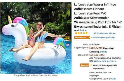 Dank dem 3€ Rabattgutschein (Coupon anklicken und der Rabatt wird automatisch beim Kauf an der Kasse abgezogen) bekommt man bis 08.07.18 bei Amazon die infinitoo Aufblasbares Einhorn Luftmatratze für 26,99€ inkl. Versand, solange der Vorrat reicht. Der aktuelle Blitzangebot-Preis für 22,94€ endet 14:45Uhr, solange der Vorrat reicht, dann kostet diese Luftmatratze nur noch 19,94€ inkl. Versand. Material: 0,3 mm hochwertiges Umweltschutz PVC Anwendbares Alter: 14 und älter Aufblasbare Größe: 210 * 110 * 115 CM (Ähnlichkeit) Geeignet für: 1-2 Erwachsene, unten 90KG / 200 Pfund Gewicht: 2.2 KG Zusätzlich Zubehör: 5 Stücke Flicken Bei Amazon wurde dieses Aufblasbare Einhorn mit sehr guten 5 Sternen benotet (35 Kundenrezensionen).