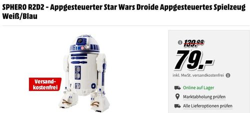 MediaMarkt bietet bis Mi. 11.07.2018, 9 Uhr im Laufe der GÖNN'-DIR-DIENSTAG - Aktion diverse Games, Film & Musik, Toys und Computer & Zubehör billiger an, nur online und versandkostenfrei. Den SPHERO R2D2 - appgesteuerten Star Wars Droide in Weiß/Blau bekommt man im Laufe dieser Aktion für 79€ inkl. Versand. Der 17 cm hohe SPHERO R2D2 wird per App gesteuert und kann mit Sphero Edu App für weitere Steuerungen programmiert werden. Authentische LEDs – Artoo’s Signature Vorder- und Rückleuchten sind voll funktionsfähig Integrierter Lautsprecher – Die Signaltöne kommen direkt vom R2D2 selbst ausfahrbarer Fahrgestell Maximale Betriebsdauer: bis zu 1 Std. Dieser Star Wars Droide wurde von MediaMarkt Kunden mit 5 Sternen benotet (5 Bewertungen).