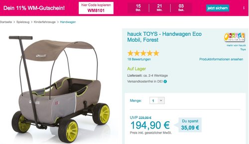 Babymarkt.de bietet heute, 17.06.18, mit dem Gutscheincode: WM8101 ganze 11% Rabatt auf fast alles. Gutscheincode wird im Warenkorb eingebenAusgeschlossen sind Produkte der Kategorien ‚Windeln & Feuchttücher‘, ‚Babynahrung‘ und ‚Ernährung für Schwangere & Mamas‘, Geschenkgutscheine, Bücher und Artikel einzelner Hersteller.Beispiel Warenkorb: Den hauck TOYS - Handwagen Eco Mobil Forest bekommt man im Laufe dieser Aktion für 173,46€ inkl. Versand, anstatt 194,90€.Dieser hauck TOYS Transportwagen/Bollerwagen wurde von Amazon Kunden mit 4 Sternen bewertet (75 Kundenrezensionen).