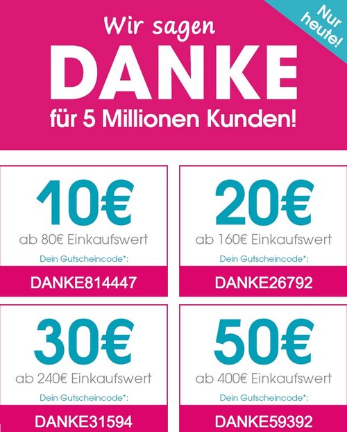 Babymarkt.de bietet heute, 21.05.18, gestaffelte Rabatte (max 50€) auf fast alles.Gutscheincode wird im Warenkorb eingeben. 10€ mit Gutscheincode: DANKE814447 (ab 80€) 20€ mit Gutscheincode: DANKE26792 (ab 160€) 30€ mit Gutscheincode: DANKE31594 (ab 240€) 50€ mit Gutscheincode: DANKE59392 (ab 400€) Beispiel Warenkorb: AquaPlay Megaset 660 Play & Go mit dem Gutschein: DANKE814447 für 70€. Ausgeschlossen sind Produkte der Kategorien ‚Windeln & Feuchttücher‘, ‚Babynahrung‘ und ‚Ernährung für Schwangere & Mamas‘, Geschenkgutscheine, Bücher und Artikel einzelner Hersteller.