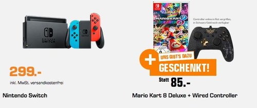 Saturn bietet bis zum 04.06 im Laufe der Geschenk-Aktion beim Kauf von ausgewählten Artikel zusätzlich noch einen Geschenk dazu an, solange der Vorrat reicht. Beim Kauf von NINTENDO Switch Neon-Rot/Neon-Blau bekommt man im Laufe dieser Aktion das Videospiel Mario Kart 8 Deluxe + Wired Controller als Geschenk gratis dazu. Die NINTENDO Switch ist eine Kombi aus mobiler und stationärer Konsole, und kann sowohl im Wohnzimmer als auch unterwegs genutzt werden. Lieferungsumfang: NINTENDO Switch Neon-Rot/Neon-Blau Mario Kart 8 Deluxe - Nintendo Switch NORDIC GAME SUPPLY Switch Wired Controller Plus Zelda: Breath of the Wild Edition, Zubehör für Nintendo Switch, Schwarz/Gold