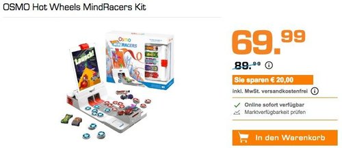 Saturn bietet bis Sa. 02.06., 9 Uhr im Laufe der - Late Night Shopping - Aktion ausgewählte Spielzeuge billiger an, versandkostenfrei und solange der Vorrat reicht. Das OSMO Hot Wheels MindRacers Kit kostet bis Samstag 9 Uhr nur noch 69,99€ inkl. Versand. OSMO Hot Wheels MindRacers ist eine Mischung aus Brettspiel und digitalem Spiel.Beinhaltet 3 Spiele: HotWheels MindRacers, Masterpiece und Newton Osmo ist ein preisgekröntes Lernspiel, das Geschicklichkeit, lösungsorientiertes Denken und Kreativität fördert Fördert Fingergeschick, strategisches Denken, Schnelligkeit und Reflexe Geeignet für Kinder ab 7 Jahren Kompatibel mit allen iPad-Modellen, ausgenommen iPad Pro 12,9 Zoll iOS App für iOS 8.0 und höher Lieferumfang: 6 HotWheels-Rennautos, 36 Spielsteine, Osmo-Basis fürs iPad, Startbahn und Aufbewahrungsbox Nicht enthalten ist ein iPad, das für das Spiel benötigt wird Amazon Kunden haben dieses Spiel mit 3,9 Sternen benotet ( 28 Kundenrezensionen).