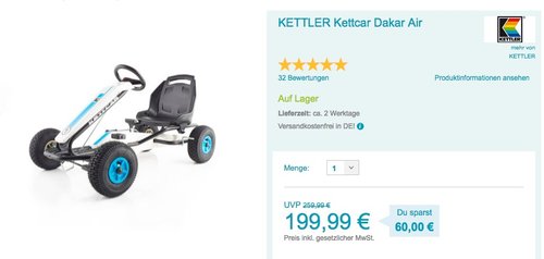 Babymarkt.de bietet heute, 11.05.18, als Tagesangebot den KETTLER Kettcar Dakar Air für 199,99€ inkl. Versand an. KETTLER Kettcar Air mit einer Luftbereifung sorgt für hohen Spiel- und Spaßfaktor und überzeugt mit dem hohen Qualitätsstandard. Der stabile und hochwertige Rahmen sorgt für optimale Sicherheit und gute Kurvenlage Ergonomisch geformter Schalensitz für bequemes und rückengeschütztes Sitzen. Praktisch: Der Sitz lässt sich ohne Werkzeug passend verstellen Der Freilauf ist zuschaltbar. So kann sich der kleine Rennfahrer auch mal gemütlich rollen lassen Die Handbremse wirkt sicher auf beide Hinterräder Die luftbereiften Räder ermöglichen ein komfortables Fahrverhalten und laufen wunderbar leise Belastbar bis max. 50 kg Körpergröße: 110 - 140 cm Alter: 5-10 Jahre