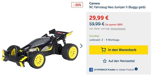 MyToys.de bietet bis zum 16.04.18 das Carrera RC Fahrzeug Neo Jumper II (Buggy gelb) für 29,99€ zzgl. 2,95€ Versand an, solange der Vorrat reicht. Das knapp 26 cm lange Neo Jumper II mit Vollfederung und Differenzialgetriebe lässt sich dank der handlichen Fernsteuerung jederzeit hervorragend bedienen.Geschwindigkeit: 12 km/h Fahrzeit: 20 MInuten Ladezeit: 90 Minuten 2,4 GHz Fernsteuerung Luftreifen