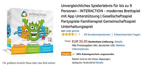 Bei Amazon bekommt man bis 16.04.18 das INTERACTION - modernes Brettspiel mit App Unterstützung dank dem 20% Gutschein für 28,76€ inkl. Versand. Das innovative hybrid Spiel vereint alle Vorteile von Brettspielen für Kinder und Erwachsene mit dem Nutzen einer App für Smartphone oder Tablet (Android und iOS) INTERACTION fordert all Eure Sinne und Talente, nur wer die Aufgaben aus den 5 Kategorien: Wissen, Kreativität, Action, Social und Games am besten meistert, wird am Ende der glückliche Sieger sein Jeder Spieler wird mit Alter, Geschlecht und Interessen in der App angelegt, wodurch die Aufgaben an die jeweilige Person angepasst werden. Amazon Kunden haben dieses spaßige Brettspiel mit 3,9 Sternen bewertet (93 Kundenrezensionen).