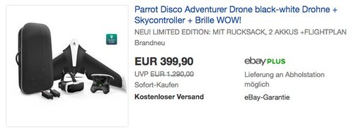 Bei eBay wird aktuell das Parrot Disco FPV Drohne-Bundle aus Drohne, Skycontroller, Brille, Rucksack, 2 Akkus und Flightplan App NEU&OVP für 399,90€ inkl. Versand angeboten. Parrot Disco FPV Drohne:Autopiloten unterstützte Steuerung/Flugplan 1080P Full-HD-Kamera mit digitalem 3-Achsen-Bildstabilisator Immersionsflug in FPV Spannweite von 115 cm und Gewicht von 750 g 45 Minuten Akkulaufzeit 80 KM/H Höchstgeschwindigkeit Lieferumfang: Parrot DISCO, Parrot Skycontroller 2, Parrot Cockpitglasses, Rucksack Parrot Disco, 1 Voucher FlightPlan In-App, 2 Akkus (inkl. 1 Reserve-Akku), 1 Ladegerät mit Kabeln, 1 Reservepropeller, 1 Smartphone- und Tablet-Halterung, 1x USB-Kabel und 1x Bedienungsanleitung Amazon Kunden haben diese Drohne mit 3,6 Sternen bewertet (31 Kundenrezensionen).